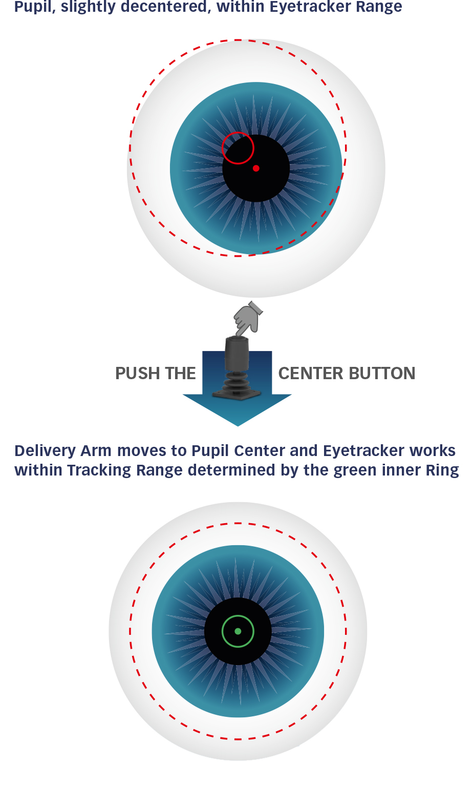 В случае, если глаз выходит за пределы зоны отслеживания во время операции, повторное центрирование легко и быстро выполняется простым нажатием центральной кнопки. Ручное изменение положения стола с помощью джойстика больше не требуется.